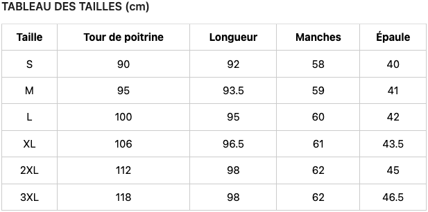 Remarque: Si vous hésitez entre deux tailles, nous vous recommandons de choisir la taille supérieure.