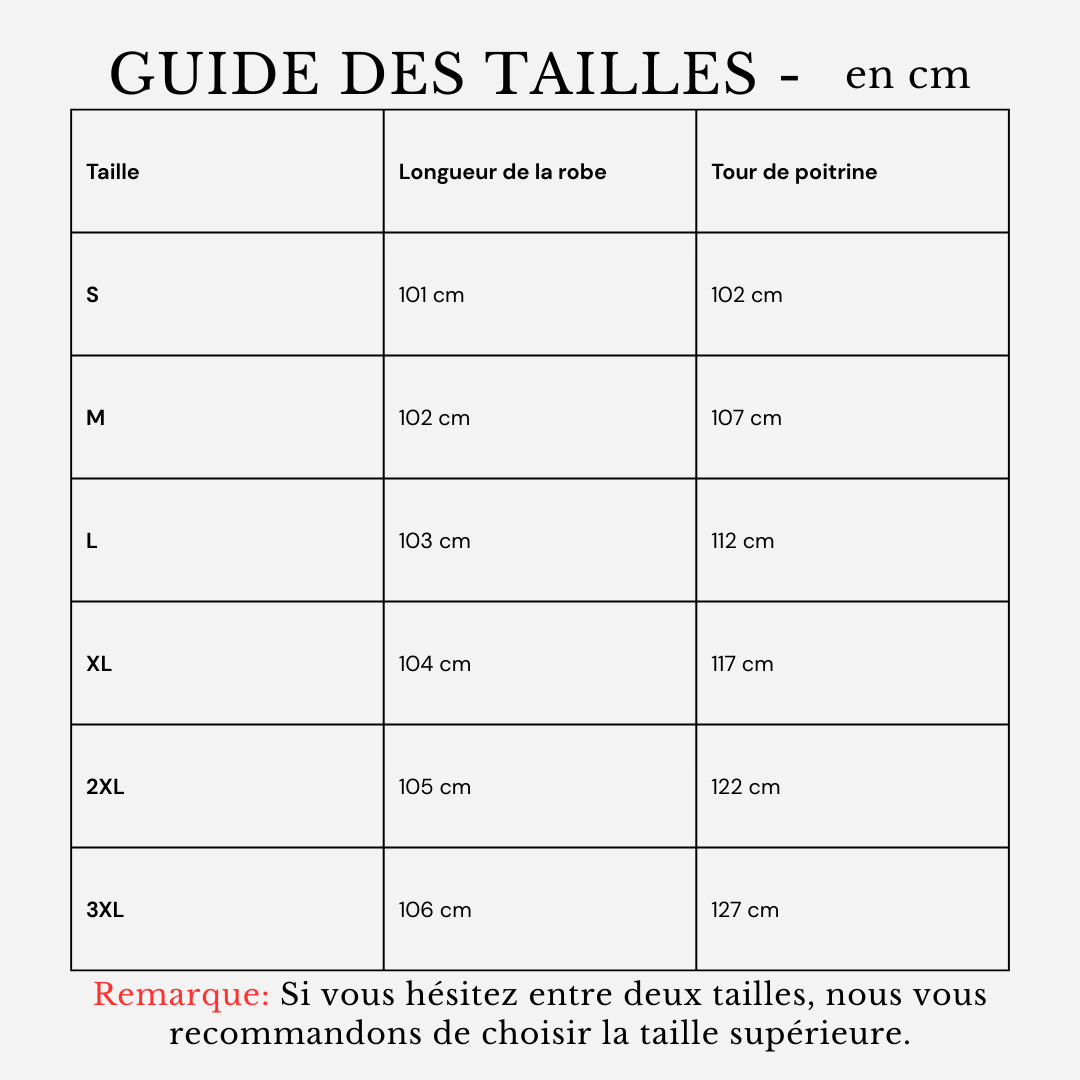 Remarque: Si vous hésitez entre deux tailles, nous vous recommandons de choisir la taille supérieure.