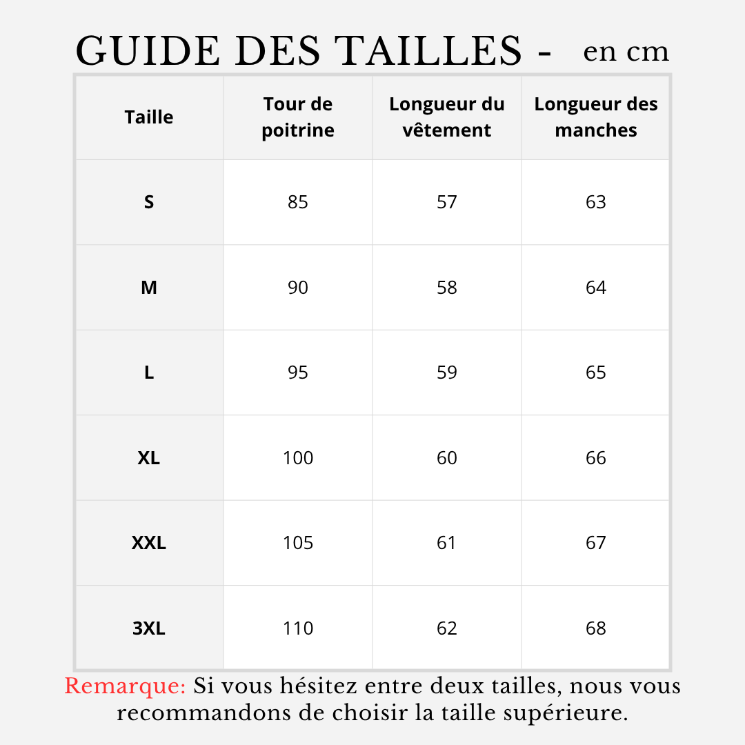 Pour t’aider à choisir la bonne taille, nous te recommandons vivement de consulter le tableau des tailles de chaque vêtement. Tu trouveras un lien vers le tableau des tailles en haut de la liste des tailles sur chaque page produit. Nous te conseillons de baser ton choix sur notre tableau des tailles et nos recommandations afin de sélectionner la taille qui te convient le mieux. Cela permet d’éviter les retours inutiles et garantit ta satisfaction.