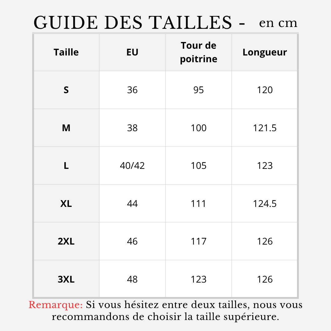 Remarque: Si vous hésitez entre deux tailles, nous vous recommandons de choisir la taille supérieure.