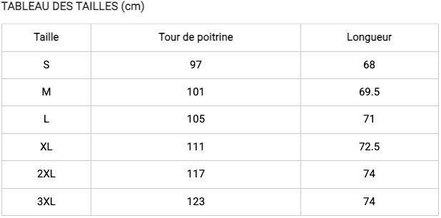 Remarque: Si vous hésitez entre deux tailles, nous vous recommandons de choisir la taille supérieure.