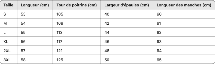 Remarque: Si vous hésitez entre deux tailles, nous vous recommandons de choisir la taille supérieure.