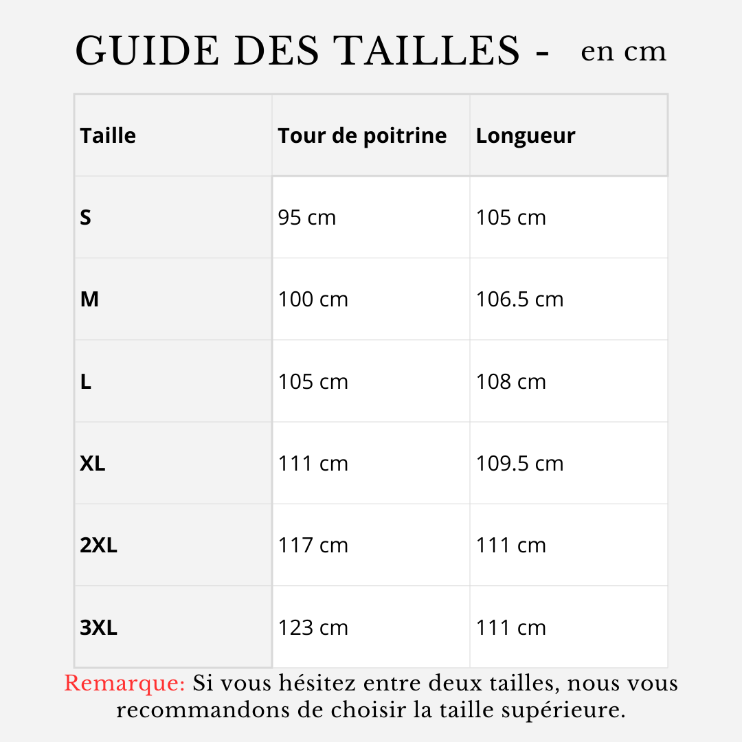 Remarque: Si vous hésitez entre deux tailles, nous vous recommandons de choisir la taille supérieure.