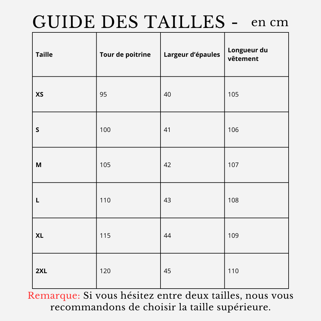 Remarque: Si vous hésitez entre deux tailles, nous vous recommandons de choisir la taille supérieure.