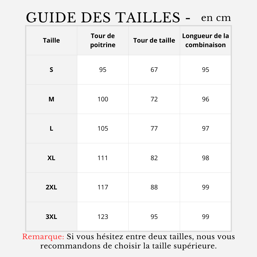 Remarque: Si vous hésitez entre deux tailles, nous vous recommandons de choisir la taille supérieure.