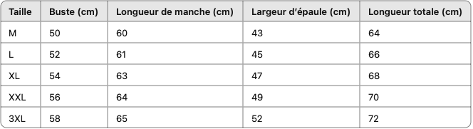 Pour t’aider à choisir la bonne taille, nous te recommandons vivement de consulter le tableau des tailles de chaque vêtement. Tu trouveras un lien vers le tableau des tailles en haut de la liste des tailles sur chaque page produit. Nous te conseillons de baser ton choix sur notre tableau des tailles et nos recommandations afin de sélectionner la taille qui te convient le mieux. Cela permet d’éviter les retours inutiles et garantit ta satisfaction.