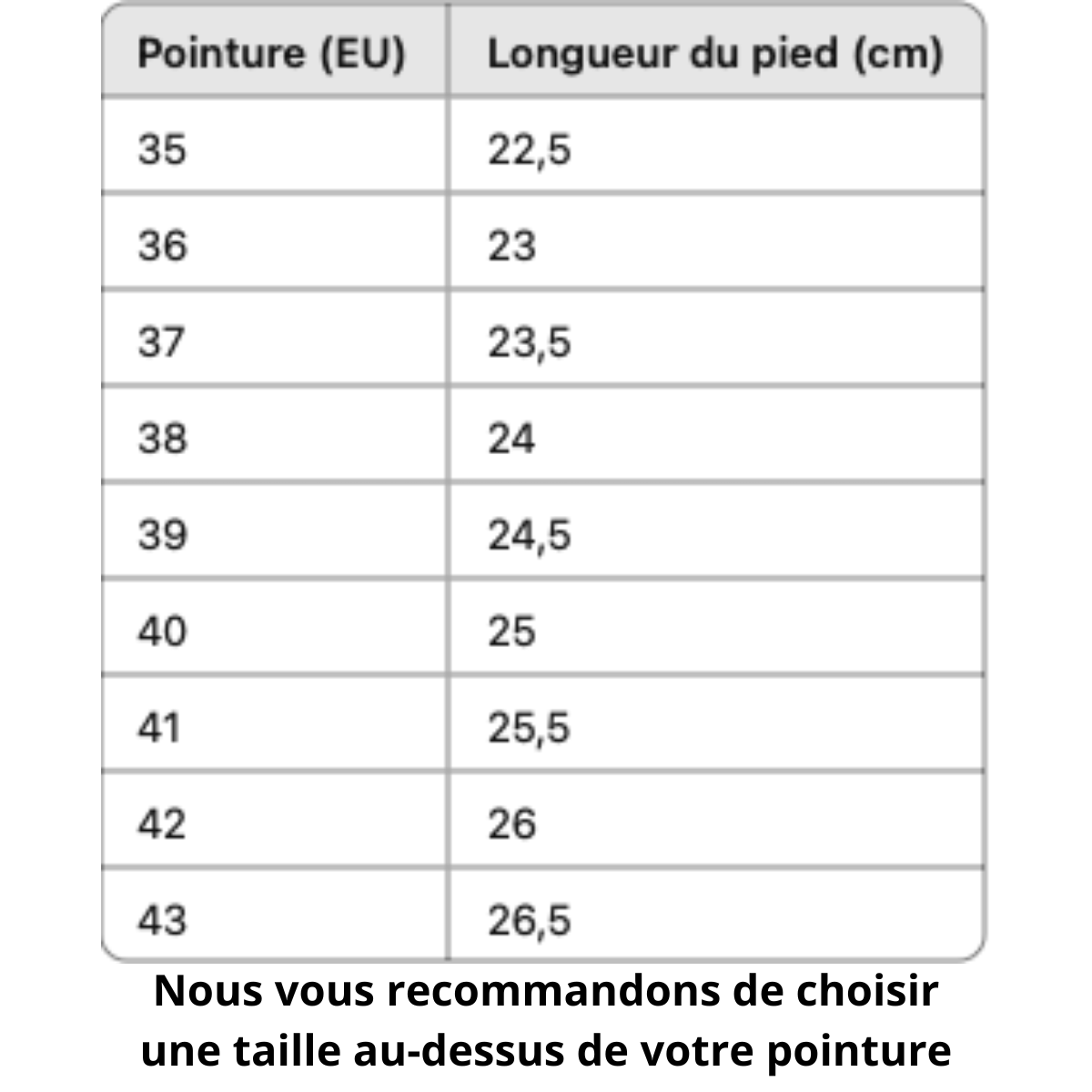 Remarque: Si vous hésitez entre deux tailles, nous vous recommandons de choisir la taille supérieure.