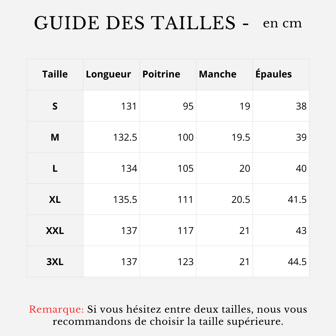 Remarque: Si vous hésitez entre deux tailles, nous vous recommandons de choisir la taille supérieure.