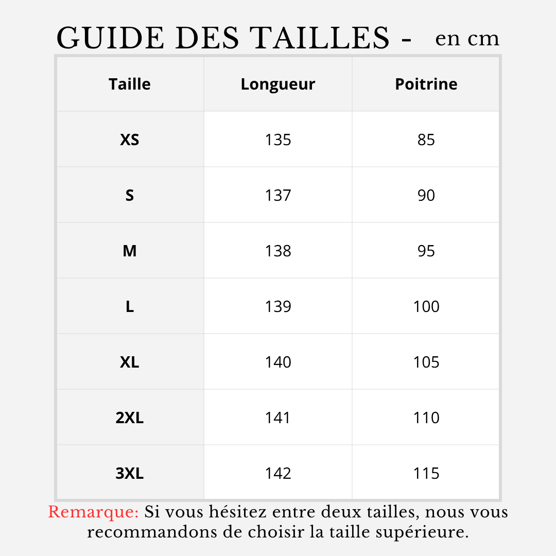 Remarque: Si vous hésitez entre deux tailles, nous vous recommandons de choisir la taille supérieure.