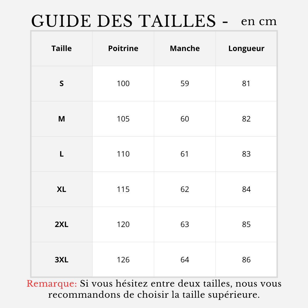 Remarque: Si tu hésites entre deux tailles, nous te conseillons de choisir la taille supérieure.