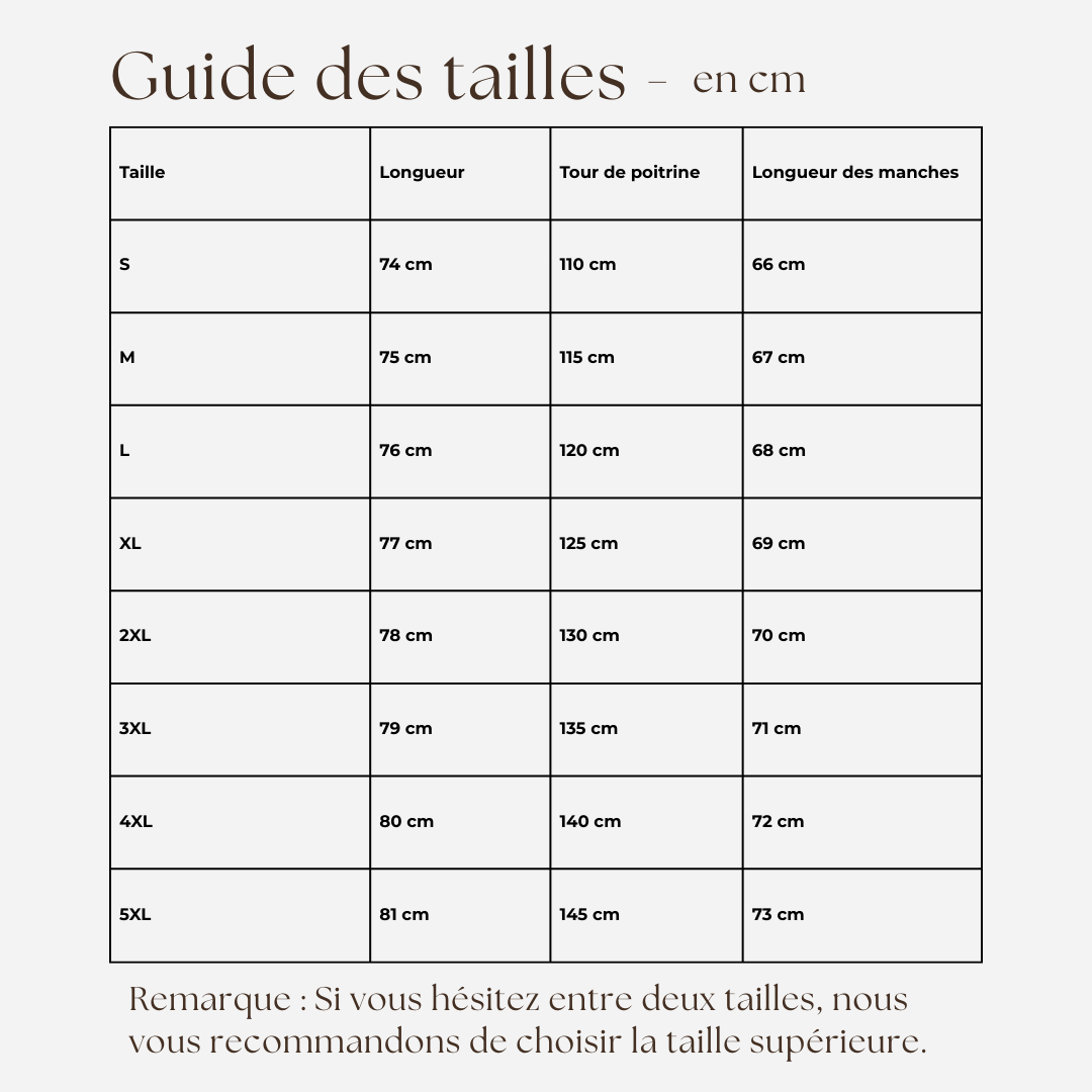 Pour t’aider à choisir la bonne taille, nous te recommandons vivement de consulter le tableau des tailles de chaque vêtement. Tu trouveras un lien vers le tableau des tailles en haut de la liste des tailles sur chaque page produit. Nous te conseillons de baser ton choix sur notre tableau des tailles et nos recommandations afin de sélectionner la taille qui te convient le mieux. Cela permet d’éviter les retours inutiles et garantit ta satisfaction.