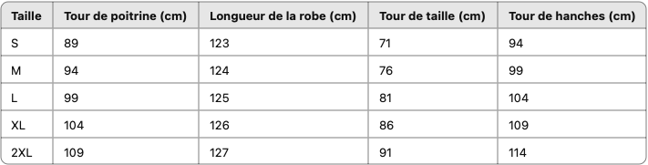 Remarque: Si vous hésitez entre deux tailles, nous vous recommandons de choisir la taille supérieure.