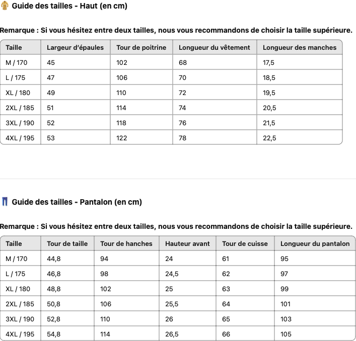 Remarque: Si vous hésitez entre deux tailles, nous vous recommandons de choisir la taille supérieure.