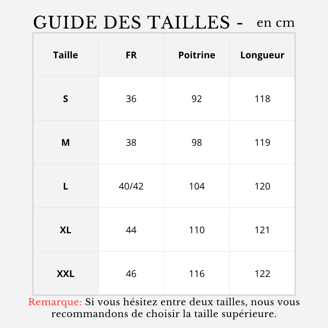 Remarque: Si vous hésitez entre deux tailles, nous vous recommandons de choisir la taille supérieure.