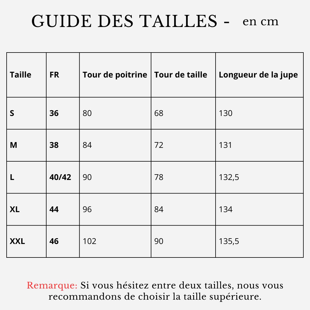 Remarque: Si vous hésitez entre deux tailles, nous vous recommandons de choisir la taille supérieure.