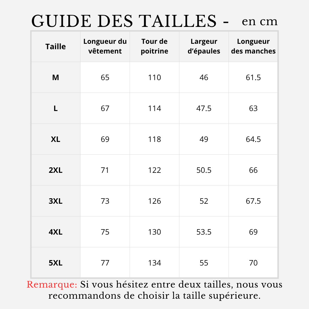 Remarque: Si tu hésites entre deux tailles, choisis la plus grande.