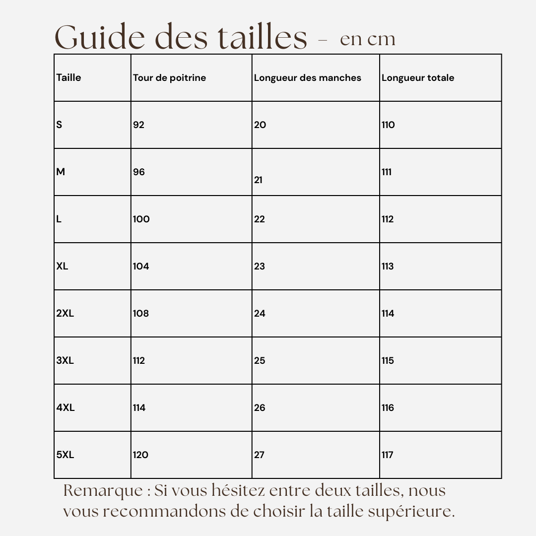 Remarque: Si vous hésitez entre deux tailles, nous vous recommandons de choisir la taille supérieure.