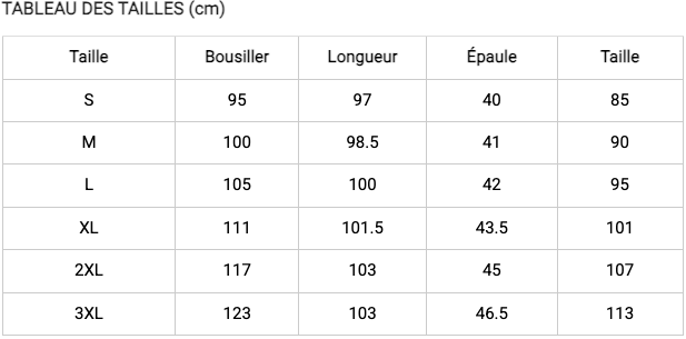 Remarque: Si vous hésitez entre deux tailles, nous vous recommandons de choisir la taille supérieure.