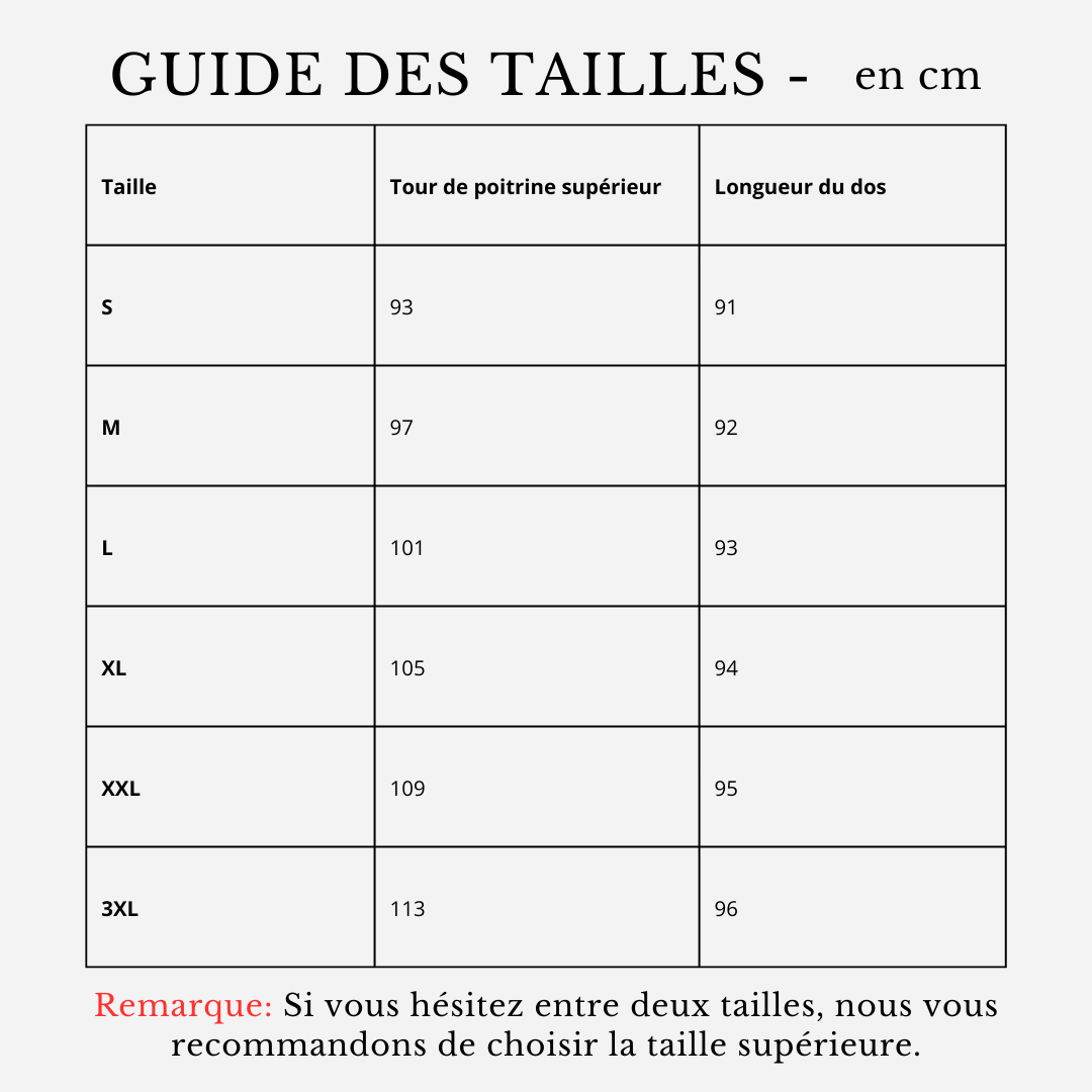 Remarque: Si vous hésitez entre deux tailles, nous vous recommandons de choisir la taille supérieure.