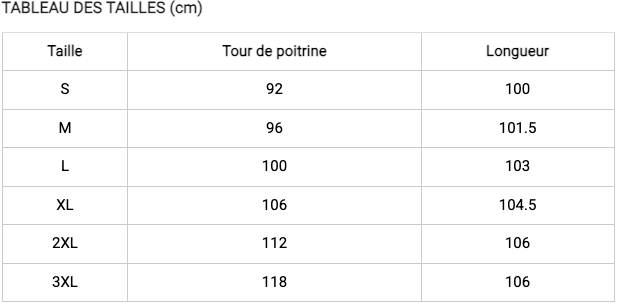 Remarque: Si vous hésitez entre deux tailles, nous vous recommandons de choisir la taille supérieure.