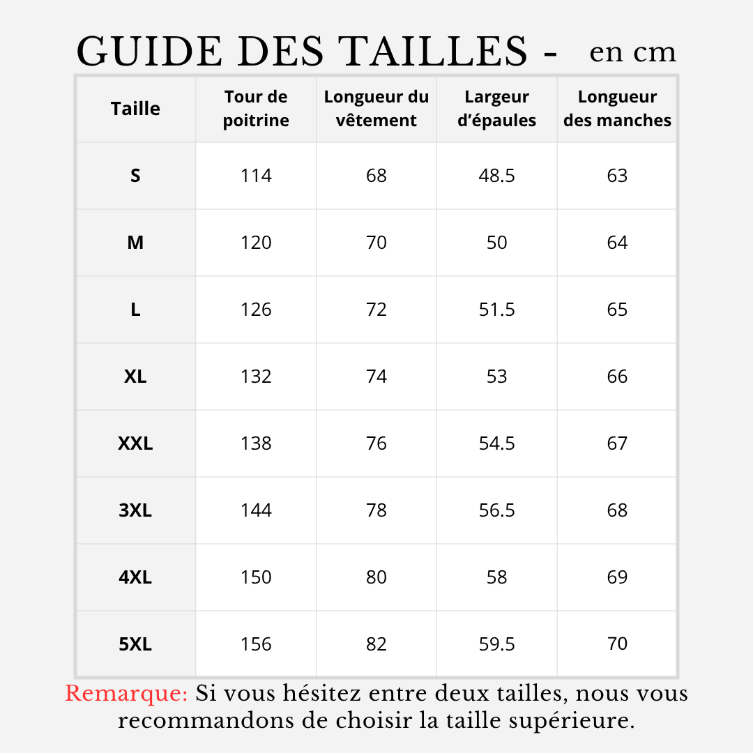 Remarque: Si vous hésitez entre deux tailles, nous vous recommandons de choisir la taille supérieure.