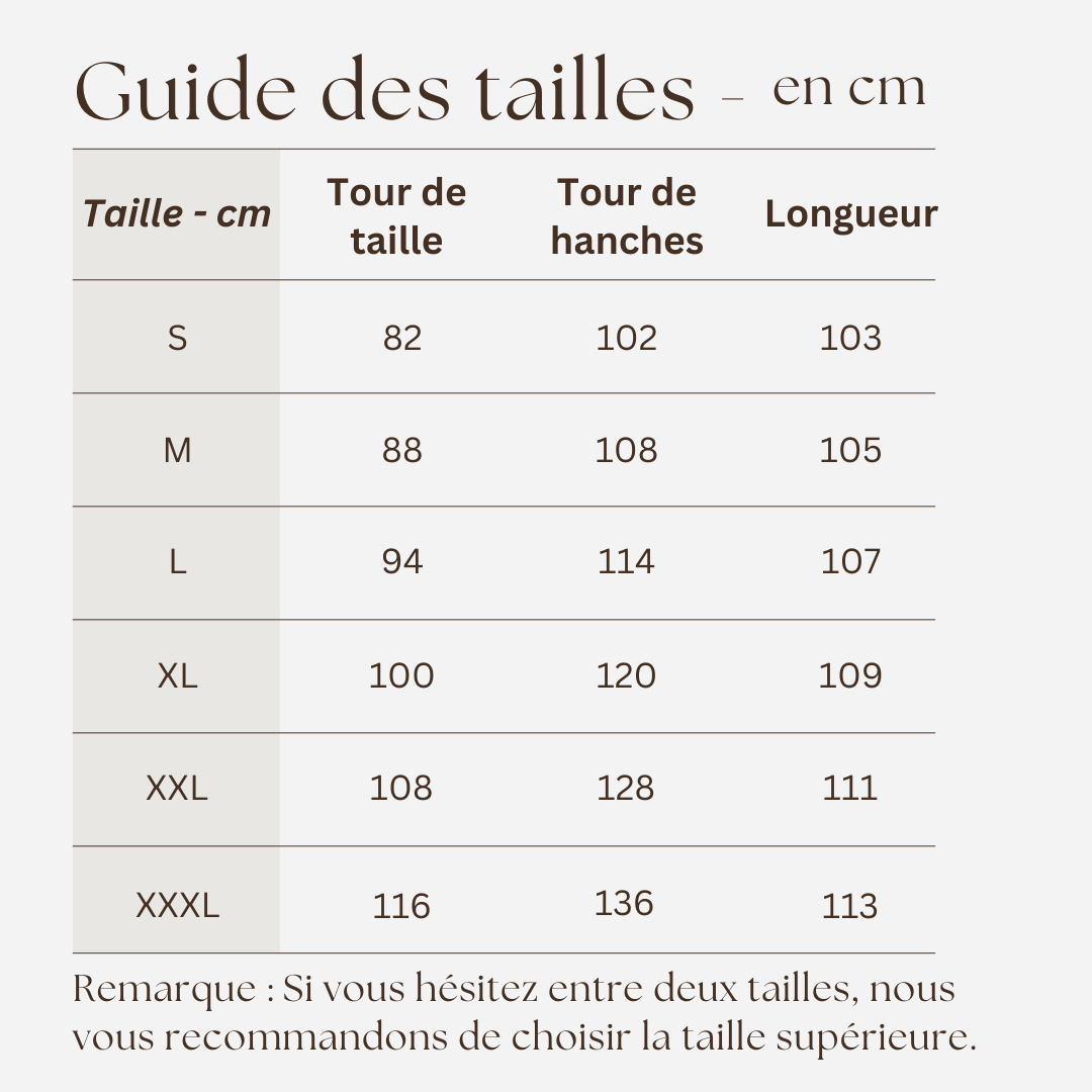 Remarque: Si vous hésitez entre deux tailles, nous vous recommandons de choisir la taille supérieure.