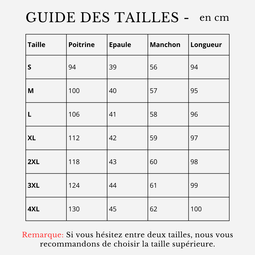 Remarque: Si vous hésitez entre deux tailles, nous vous recommandons de choisir la taille supérieure.