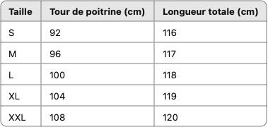 Remarque: Si vous hésitez entre deux tailles, nous vous recommandons de choisir la taille supérieure.