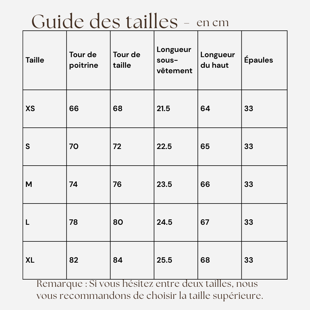 Remarque: Si vous hésitez entre deux tailles, nous vous recommandons de choisir la taille supérieure.