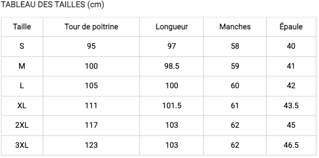 Remarque: Si vous hésitez entre deux tailles, nous vous recommandons de choisir la taille supérieure.