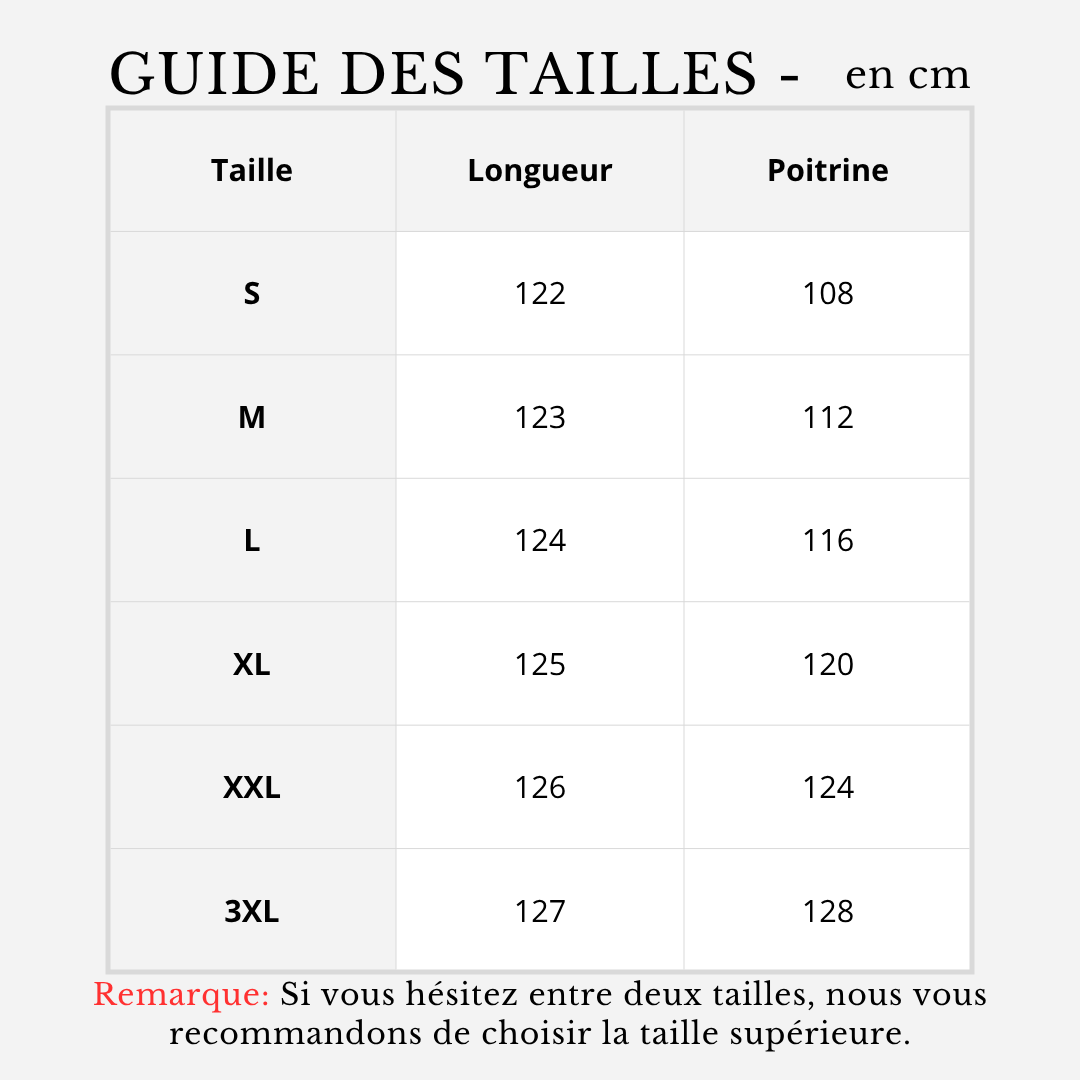 Remarque: Si vous hésitez entre deux tailles, nous vous recommandons de choisir la taille supérieure.